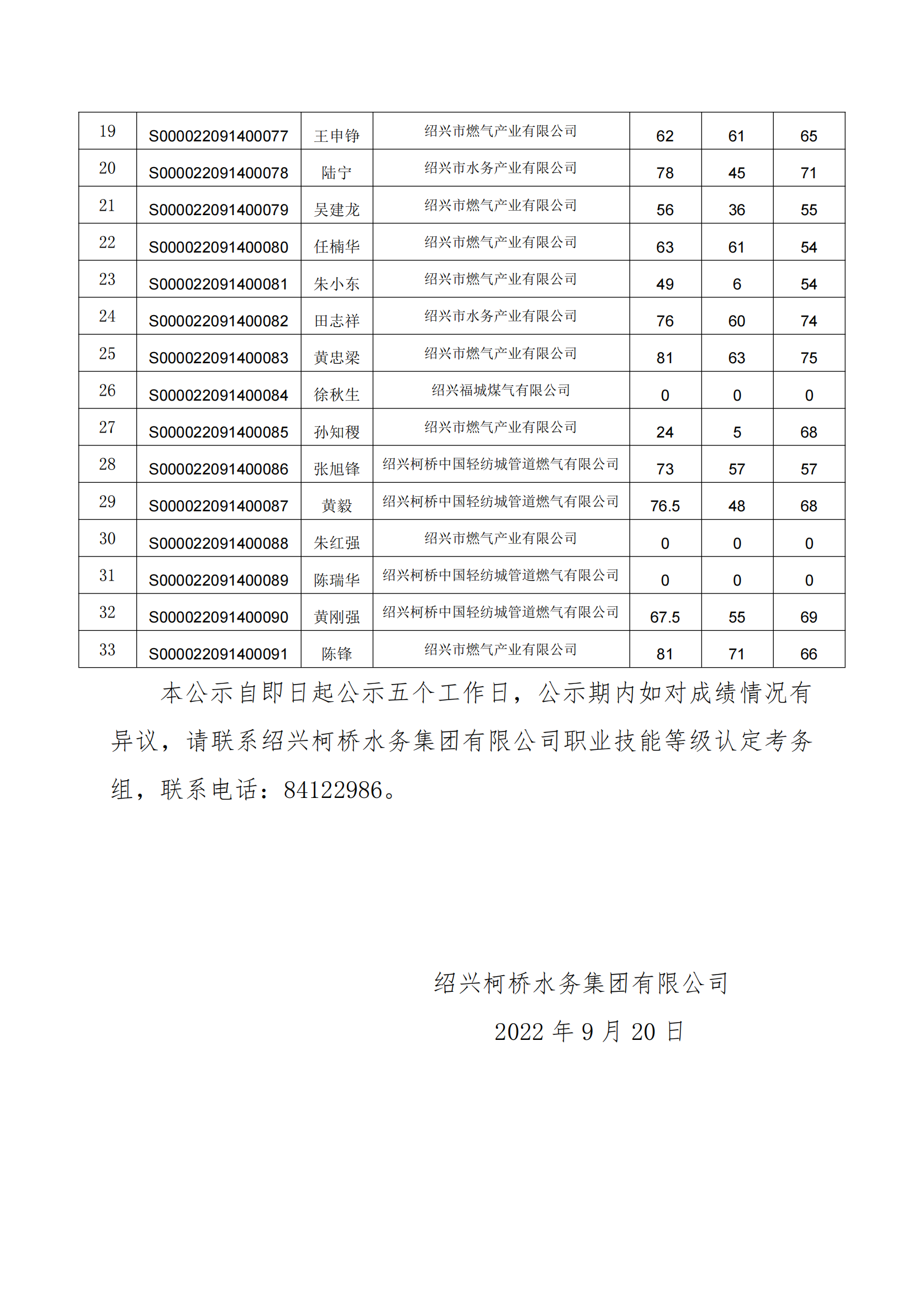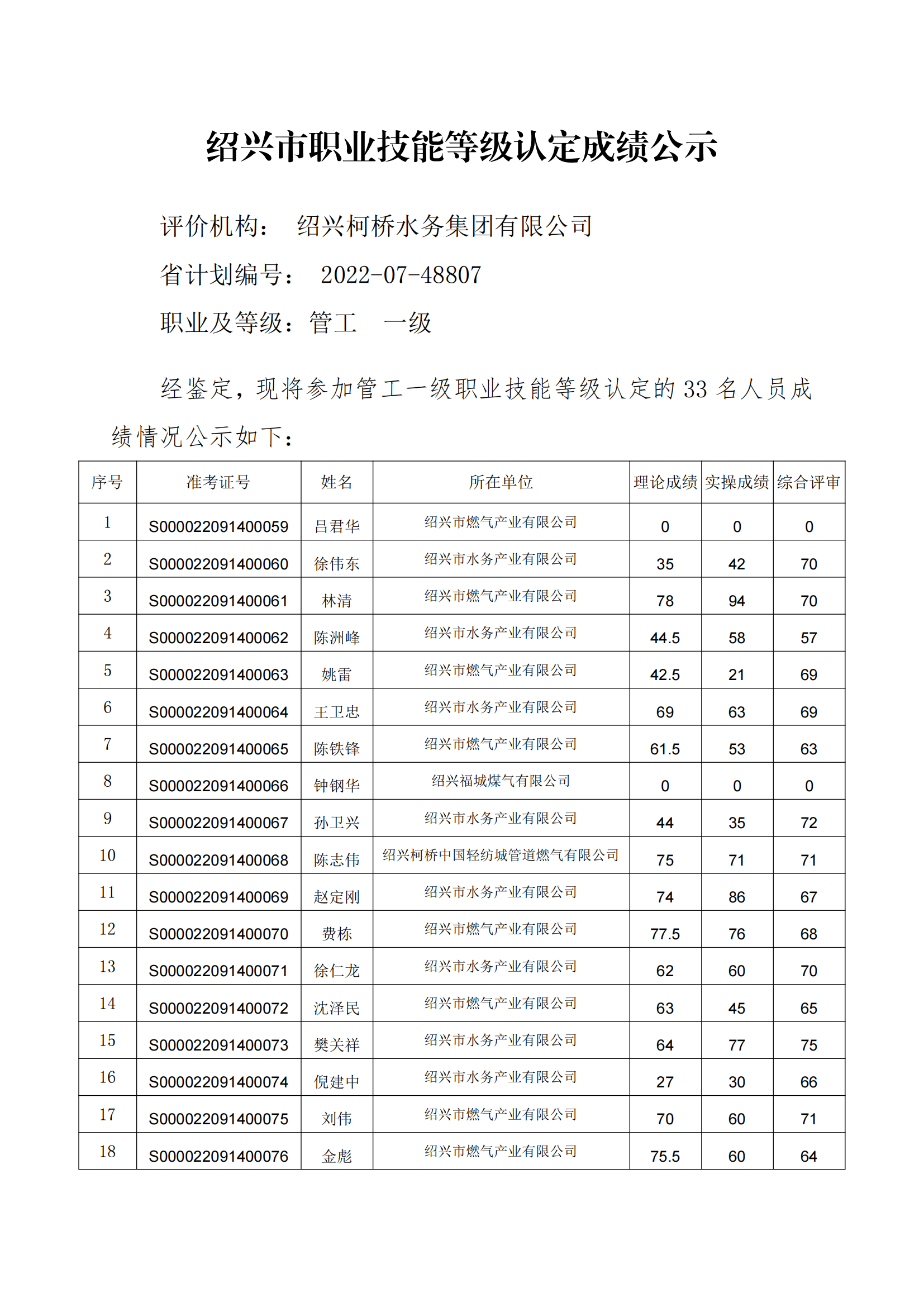 紹興市職業技能等級認定成績公示(管工一級)