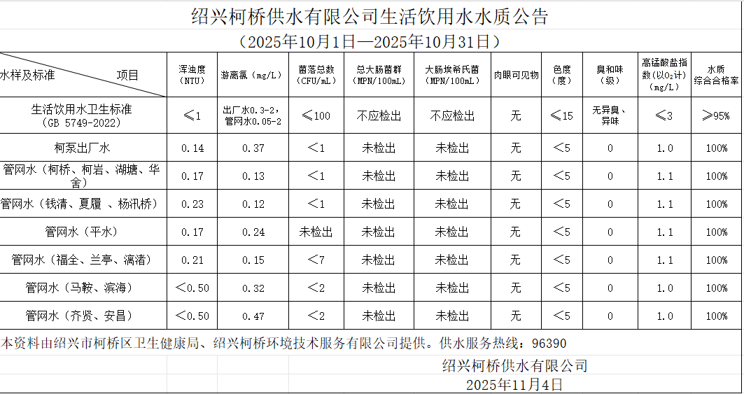 生活飲用水水質公告(2025年10月1日—2025年10月31日)