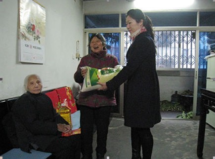 圖:孤寡老人接過我們的慰問品,開懷笑顏