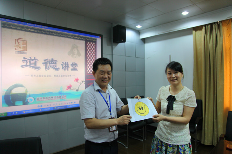本次“道德講堂”共分聽歌曲、學模范、誦經典、發善心、送吉祥、向“德”字鞠躬敬禮等6個環節。講堂上,大家一起聆聽了《公民道德歌》,觀看了感動中國人物林俊德院士事跡報告,學習了道德經典語句“德在人先,利居人后”,并結合自身實際,分別暢談了對道德的感悟。本期講堂,還為大家準備了一個“笑臉”,希望大家在工作中、生活中保持微笑,用笑臉迎接工作、迎接生活、迎接身邊每一個人。最后,講堂在大家向“德”字鞠躬敬禮中落下帷幕,使干部職工接受了一次道德的感化與洗禮。