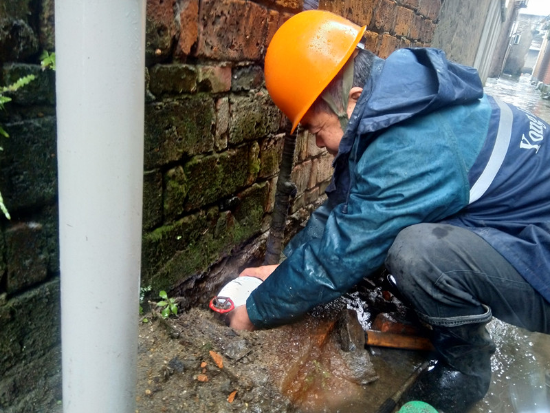 圖為供水管道工在雨雪中更換遠(yuǎn)程水表
